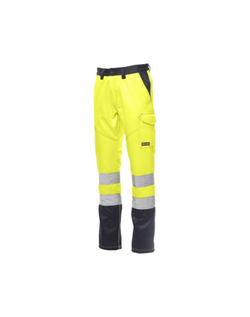 Ανδρικό, χειμερινό, δίχρωμο παντελόνι υψηλής ορατότητας με ανακλαστικές ταινίες, ελαστικό στα πλαϊνά και με θηλιές ζώνης στη μέση. Κλείσιμο με φερμουάρ και πλαστικό κουμπί, δυο κλασικές μπροστινές τσέπες, μια πλαϊνή τσέπη με καπάκι, μια τσέπη για μετροταινία και δυο πίσω τσέπες, εκ των οποίων μια ανοιχτή και μια με καπάκι και velcro. Ραφές με αντίθεση και τριπλές ραφές στον καβάλο και στο εσωτερικό του ποδιού. Σύνθεση από 80% πολυεστέρα και 20% βαμβάκι.