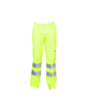 Ανδρικό, δίχρωμο, παντός εποχής παντελόνι υψηλής ορατότητας με ανακλαστικές ταινίες, ελαστικό στο πλάι και με θηλιές ζώνης στη μέση. Κλείσιμο με φερμουάρ και πλαστικό κουμπί, δυο κλασικές μπροστινές τσέπες, μια πλαϊνή τσέπη με καπάκι, μια τσέπη για μετροταινία και δυο πίσω τσέπες, εκ των οποίων μια ανοιχτή και μια με καπάκι και velcro. Ραφές με αντίθεση και τριπλή ραφή στον καβάλο και το εσωτερικό του ποδιού. Σύνθεση από 50% βαμβάκι και 50% πολυεστέρα.