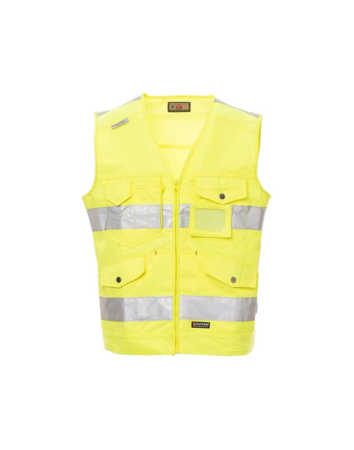 Γιλέκο τύπου τζιν υψηλής ορατότητας με ανακλαστικές ταινίες 3Μ και μπροστινό κλείσιμο με φερμουάρ. Δυο μπροστινές τσέπες καγκουρό με καπάκι και μεταλλικό κουμπί και δυο τσέπες στο στήθος εκ των οποίων η μια με καπάκι και αποσπώμενη θήκη για κάρτα και η άλλη με θήκη για κινητό. Σύνθεση από 60% βαμβάκι και 40% πολυεστέρα.