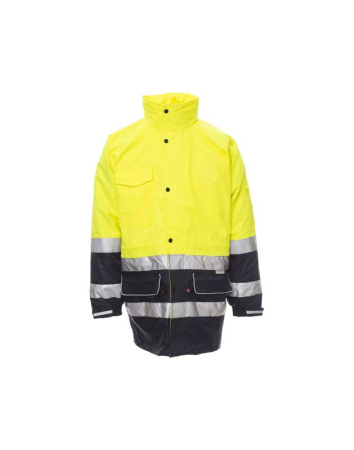 Ανδρικό παρκά για όλες τις χρήσεις, υψηλής ορατότητας με ταινίες 3Μ. Πλαστικό φερμουάρ με καπάκι και velcro, αναδιπλούμενη κουκούλα, ελαστικές ρυθμιζόμενες μανσέτες, δυο κρυφές μπροστινές τσέπες και μια τσέπη στο στήθος με θήκη για κάρτα. Με επένδυση, fleece στο εσωτερικό του γιακά, εσωτερική τσέπη και θερμοκολλητικές ραφές. Σύνθεση από 100% πολυεστέρα επικαλυμμένο με πολυουρεθάνη.