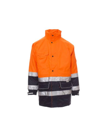 Ανδρικό παρκά για όλες τις χρήσεις, υψηλής ορατότητας με ταινίες 3Μ. Πλαστικό φερμουάρ με καπάκι και velcro, αναδιπλούμενη κουκούλα, ελαστικές ρυθμιζόμενες μανσέτες, δυο κρυφές μπροστινές τσέπες και μια τσέπη στο στήθος με θήκη για κάρτα. Με επένδυση, fleece στο εσωτερικό του γιακά, εσωτερική τσέπη και θερμοκολλητικές ραφές. Σύνθεση από 100% πολυεστέρα επικαλυμμένο με πολυουρεθάνη.