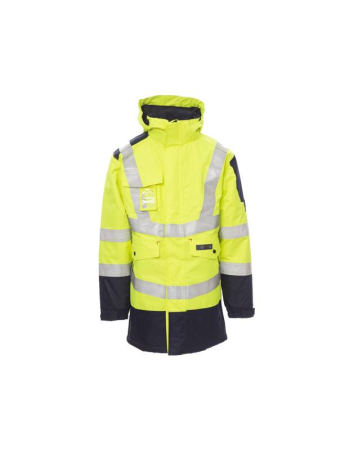 Δίχρωμο, υψηλής ορατότητας παρκά για όλες τις χρήσεις, με πλαστικό φερμουάρ 8 mm με καπάκι velcro, με αποσπώμενη, εργονομική κουκούλα με κορδόνι, ελαστικές ρυθμιζόμενες μανσέτες, ευρύχωρες μπροστινές τσέπες με καπάκι και κουμπί, δυο με φερμουάρ, αναδιπλούμενη/αποσπώμενη θήκη για κάρτα και επένδυση. Σύνθεση από 98% επεξεργασμένο πολυεστέρα και 2% ανθρακονήματα.