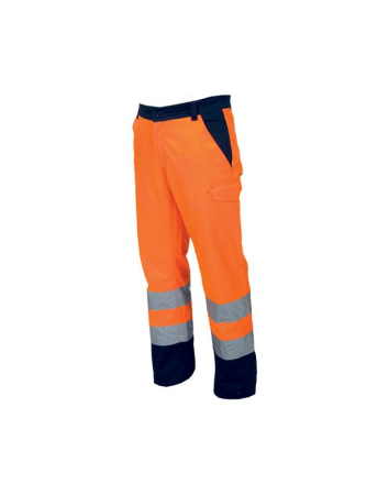 Ανδρικό, δίχρωμο, παντός εποχής παντελόνι υψηλής ορατότητας με ανακλαστικές ταινίες, ελαστικό στο πλάι και με θηλιές ζώνης στη μέση. Κλείσιμο με φερμουάρ και πλαστικό κουμπί, δυο κλασικές μπροστινές τσέπες, μια πλαϊνή τσέπη με καπάκι, μια τσέπη για μετροταινία και δυο πίσω τσέπες, εκ των οποίων μια ανοιχτή και μια με καπάκι και velcro. Ραφές με αντίθεση και τριπλή ραφή στον καβάλο και το εσωτερικό του ποδιού. Σύνθεση από 50% βαμβάκι και 50% πολυεστέρα.