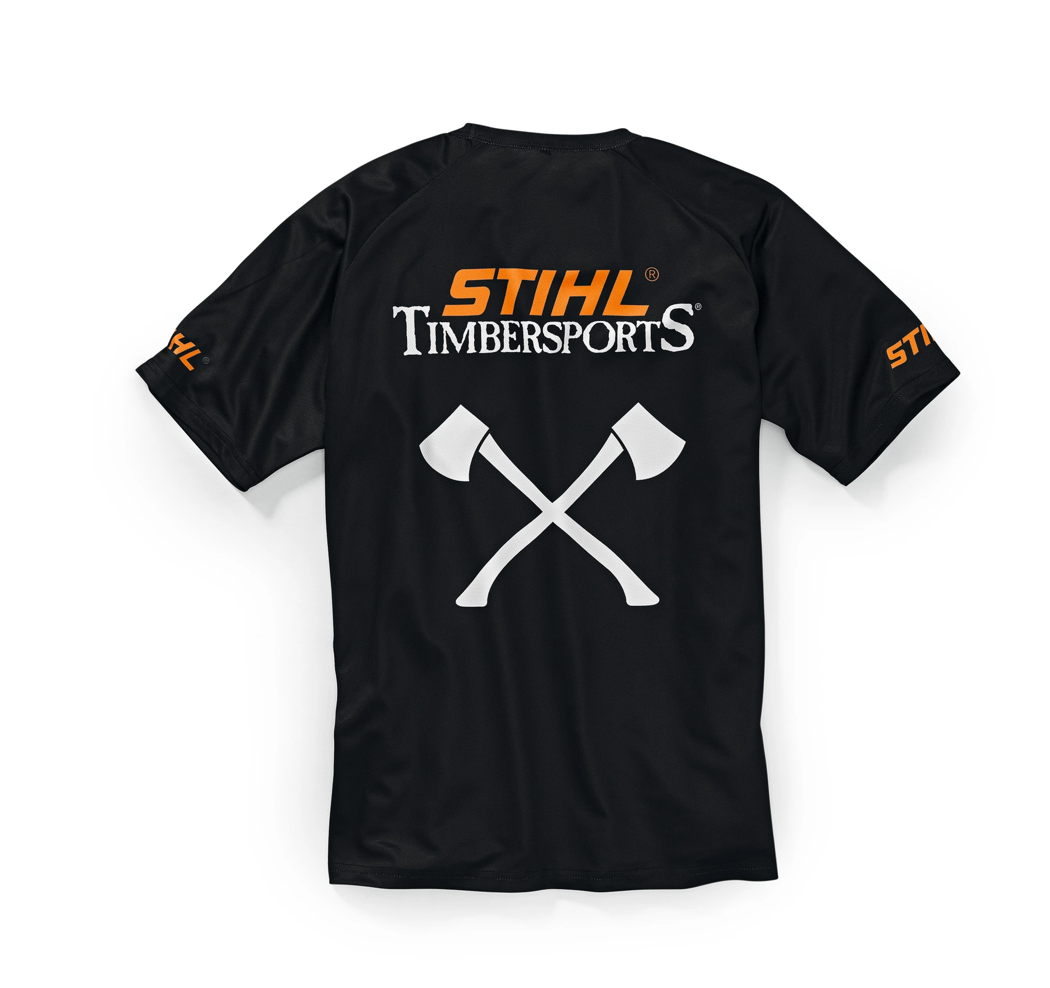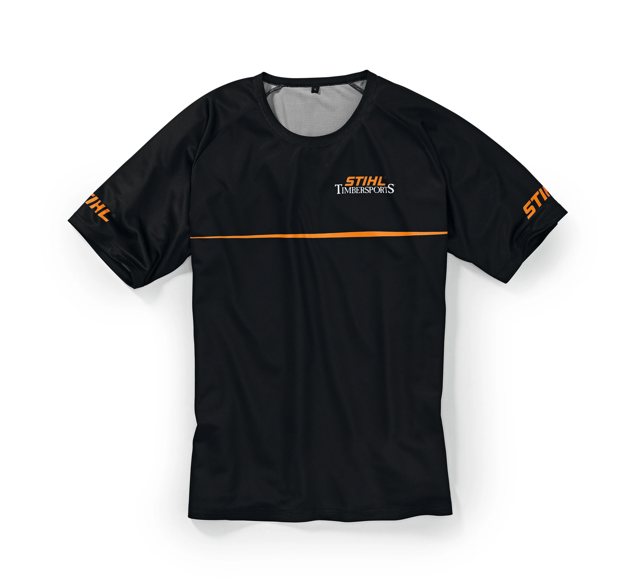 Σε μαύρο χρώμα. 100 % πολυεστέρας, λογότυπος STIHL TIMBERSPORTS® τυπωμένος στον θώρακα με πορτοκαλί ρίγες, λογότυπος STIHL και στα δύο μανίκια, σταυρωτά τσεκούρια σε