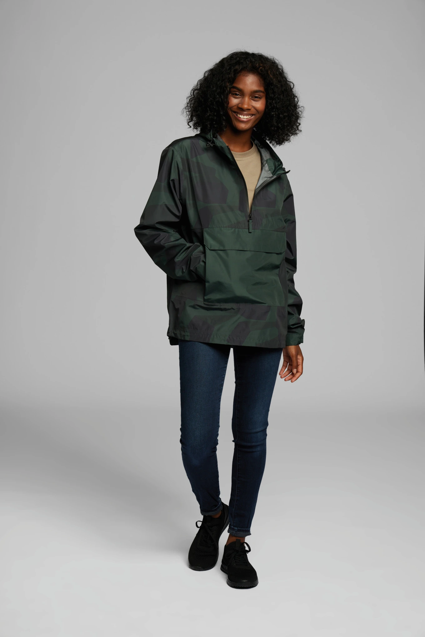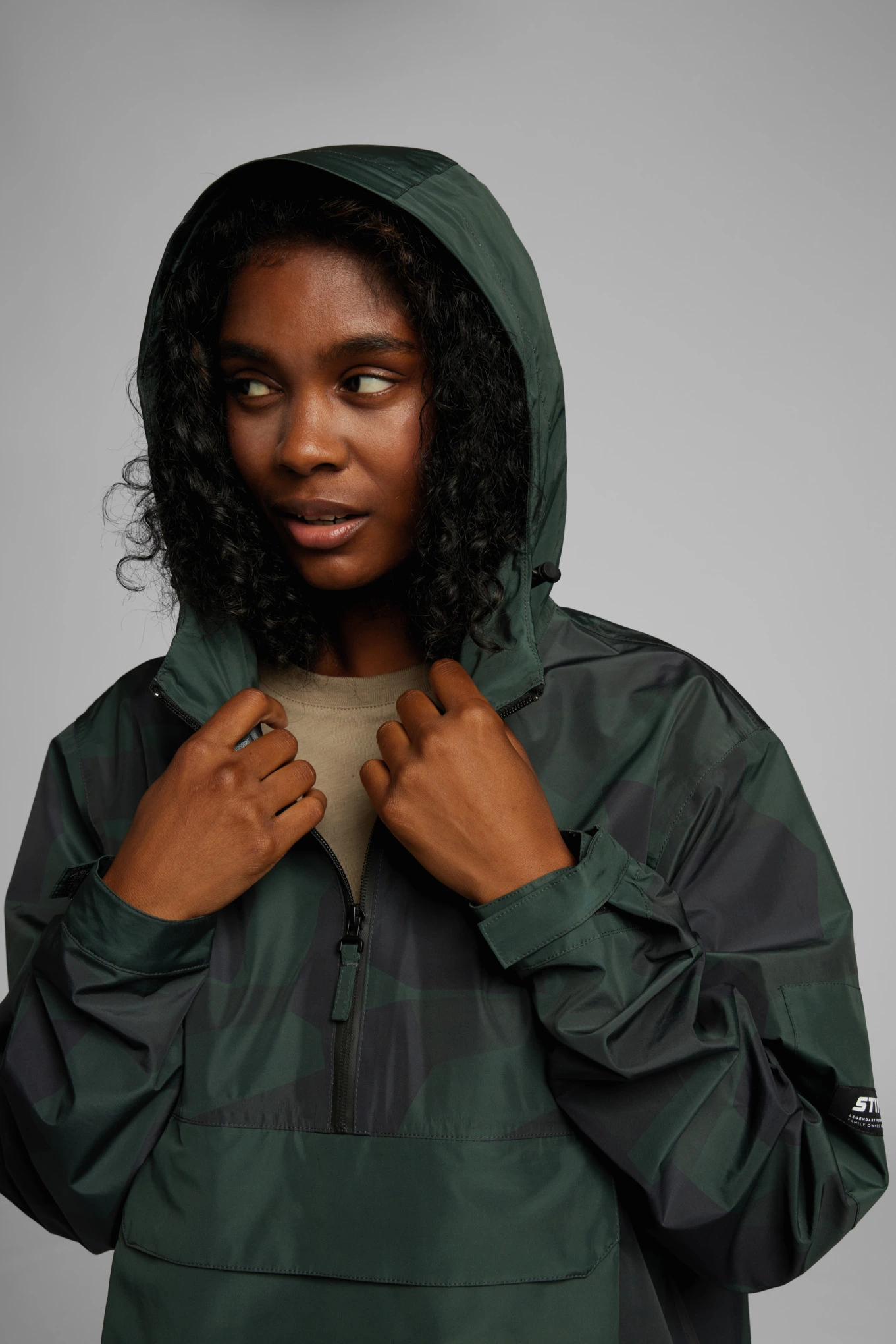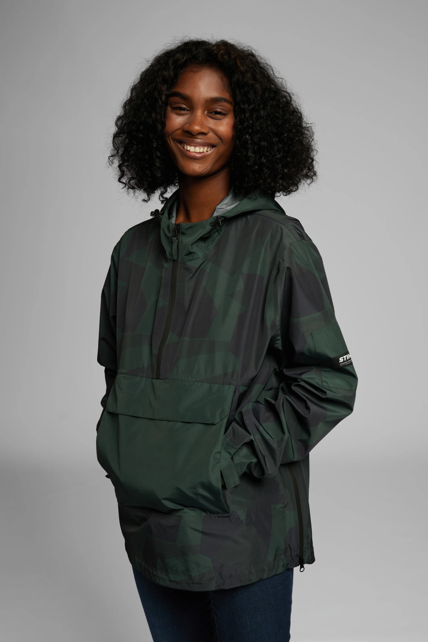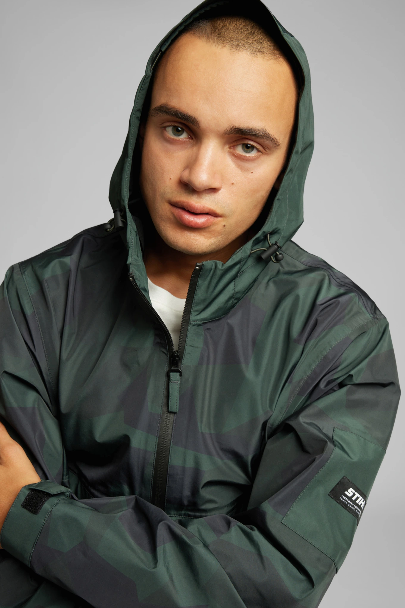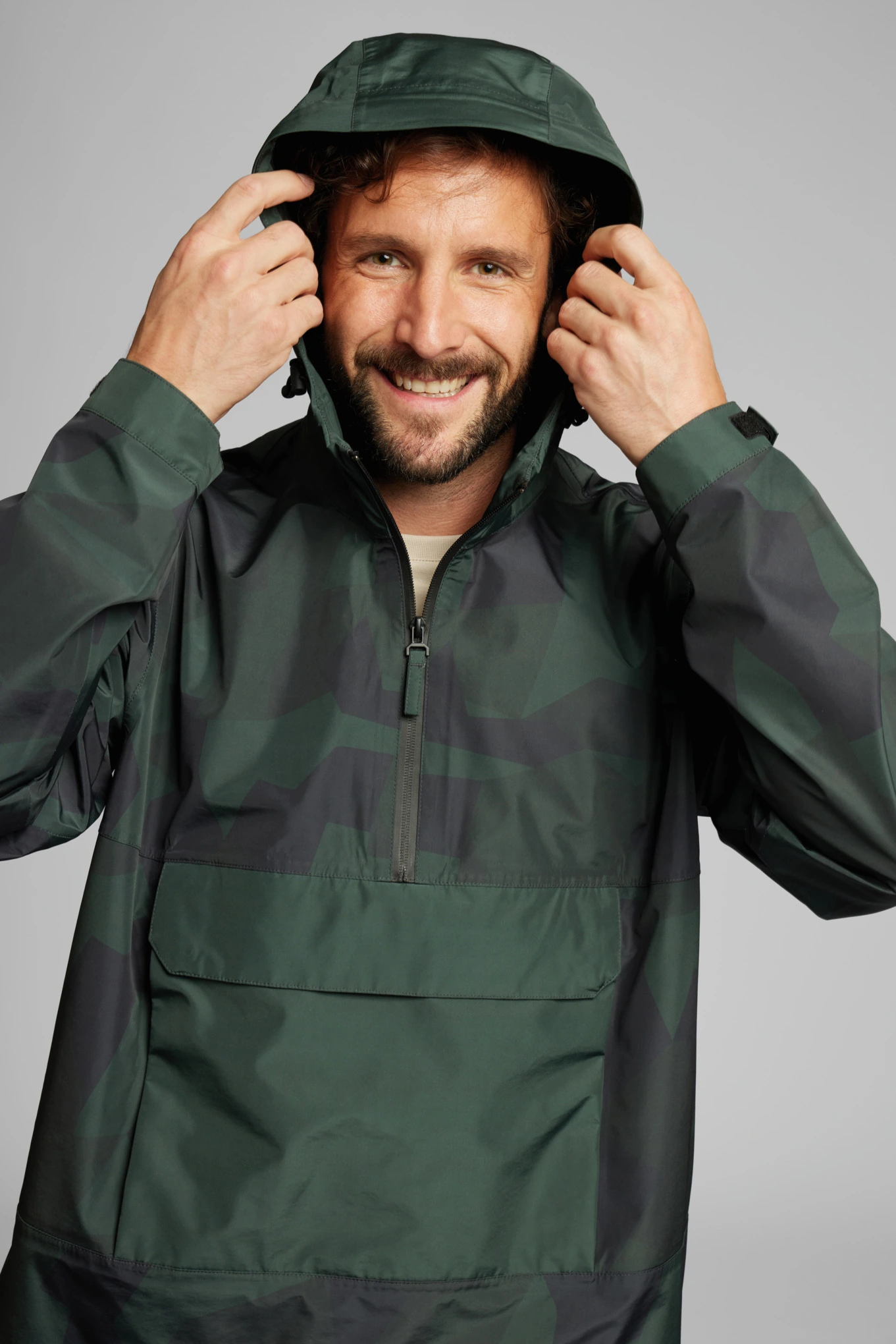 Πράσινο μπουφάν βροχής με εμφάνιση καμουφλάζ, με μεμβράνη TPU, στήλη ύδατος 5.000 mm και καλό αερισμό. Μπουφάν με σχεδιασμό πουλόβερ με φαρδύ λαιμό και πλαϊνό φερμουάρ, για να είναι εύκολο το τράβηγμα του ρούχου. Οι ραφές είναι επικαλυμμένες και τα μανίκια μπορούν να σφίγγουν επιπλέον με Velcro για να κρατούν τη βροχή μακριά. Η πρακτική μεγάλη μπροστινή τσέπη μπορεί να χρησιμοποιηθεί για την ασφαλή μεταφορά κλειδιών, κινητού τηλεφώνου, πορτοφολιού κ.λπ. στη βροχή. Στο αριστερό μανίκι υπάρχει μια μικρή υφαντή ετικέτα "LEGENDARY PERFORMANCE".