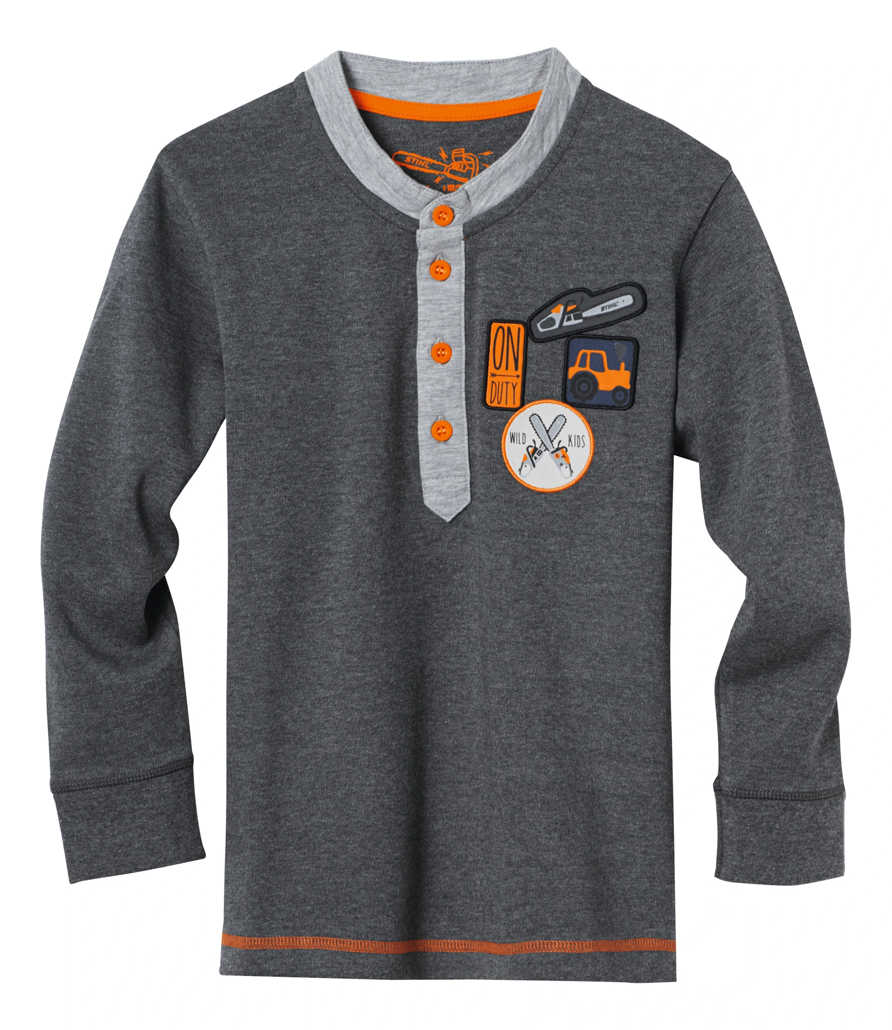 Ανθρακί μπλούζα από 60% βαμβάκι, και 40% πολυεστέρα, με αντιολισθητικό κάλυμμα κουμπιών, εμβλήματα σε σχήμα καρτούν, και μανίκια με μανσέτα.