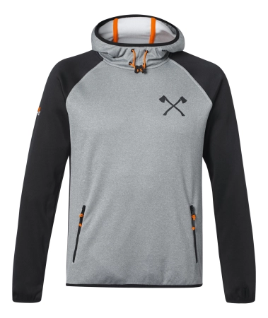 Σκούρο γκρι αθλητικό φούτερ, από 100% πολυεστέρα. Διαθέτει κουκούλα υψηλής αντοχής με ελαστικό κορδόνι για ρύθμιση πλάτους, μανίκια raglan με τρύπα αντίχειρα, δύο τσέπες με φερμουάρ, "STIHL TIMBERSPORTS®" τυπωμένο στον άνω βραχίονα, και εγκάρσια τσεκούρια τυπωμένα στο στήθος