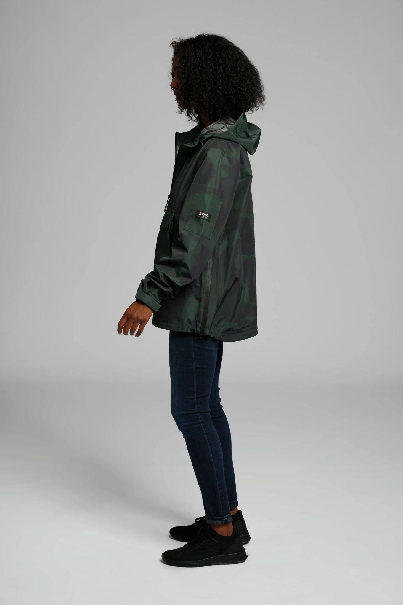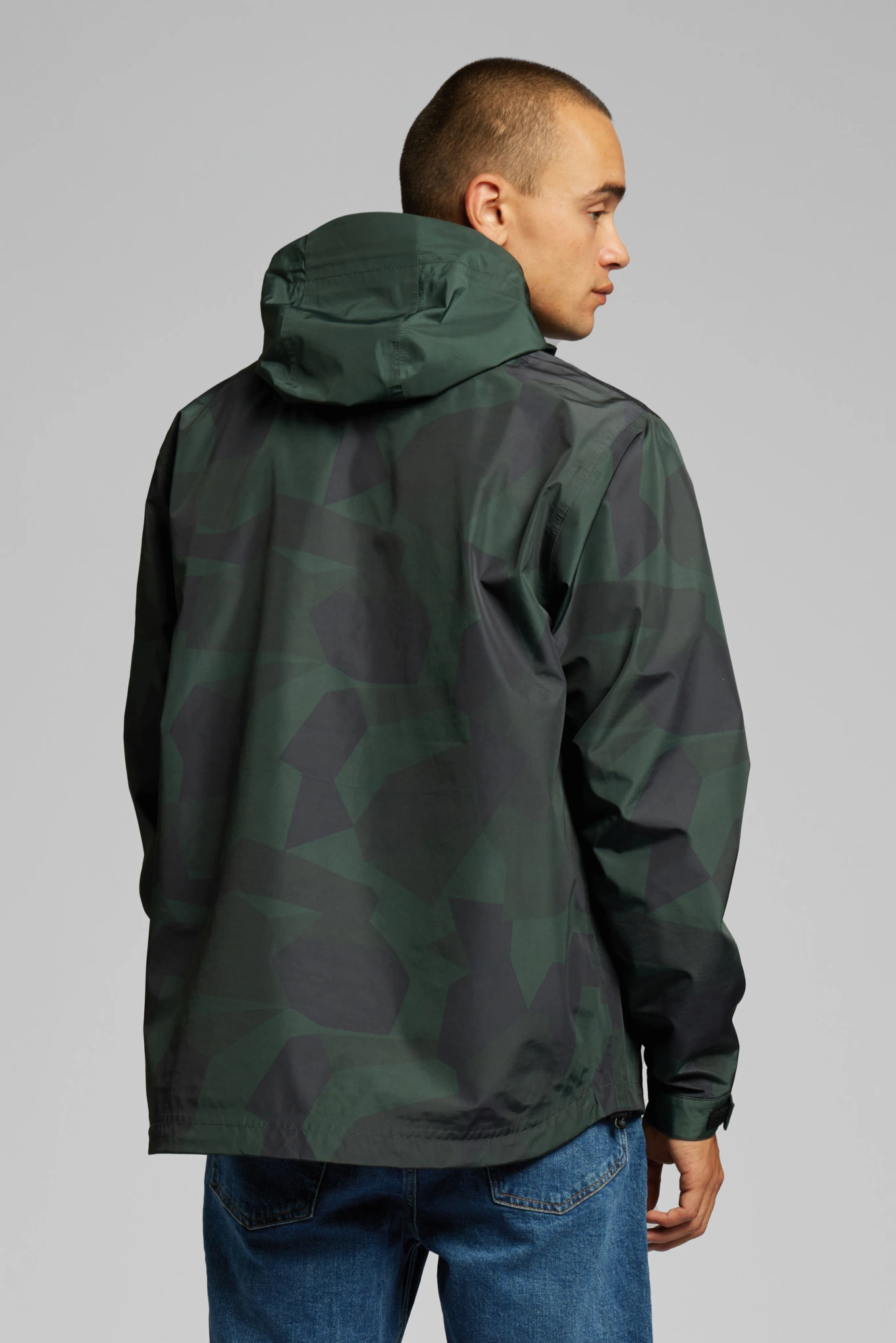 Πράσινο μπουφάν βροχής με εμφάνιση καμουφλάζ, με μεμβράνη TPU, στήλη ύδατος 5.000 mm και καλό αερισμό. Μπουφάν με σχεδιασμό πουλόβερ με φαρδύ λαιμό και πλαϊνό φερμουάρ, για να είναι εύκολο το τράβηγμα του ρούχου. Οι ραφές είναι επικαλυμμένες και τα μανίκια μπορούν να σφίγγουν επιπλέον με Velcro για να κρατούν τη βροχή μακριά. Η πρακτική μεγάλη μπροστινή τσέπη μπορεί να χρησιμοποιηθεί για την ασφαλή μεταφορά κλειδιών, κινητού τηλεφώνου, πορτοφολιού κ.λπ. στη βροχή. Στο αριστερό μανίκι υπάρχει μια μικρή υφαντή ετικέτα "LEGENDARY PERFORMANCE".
