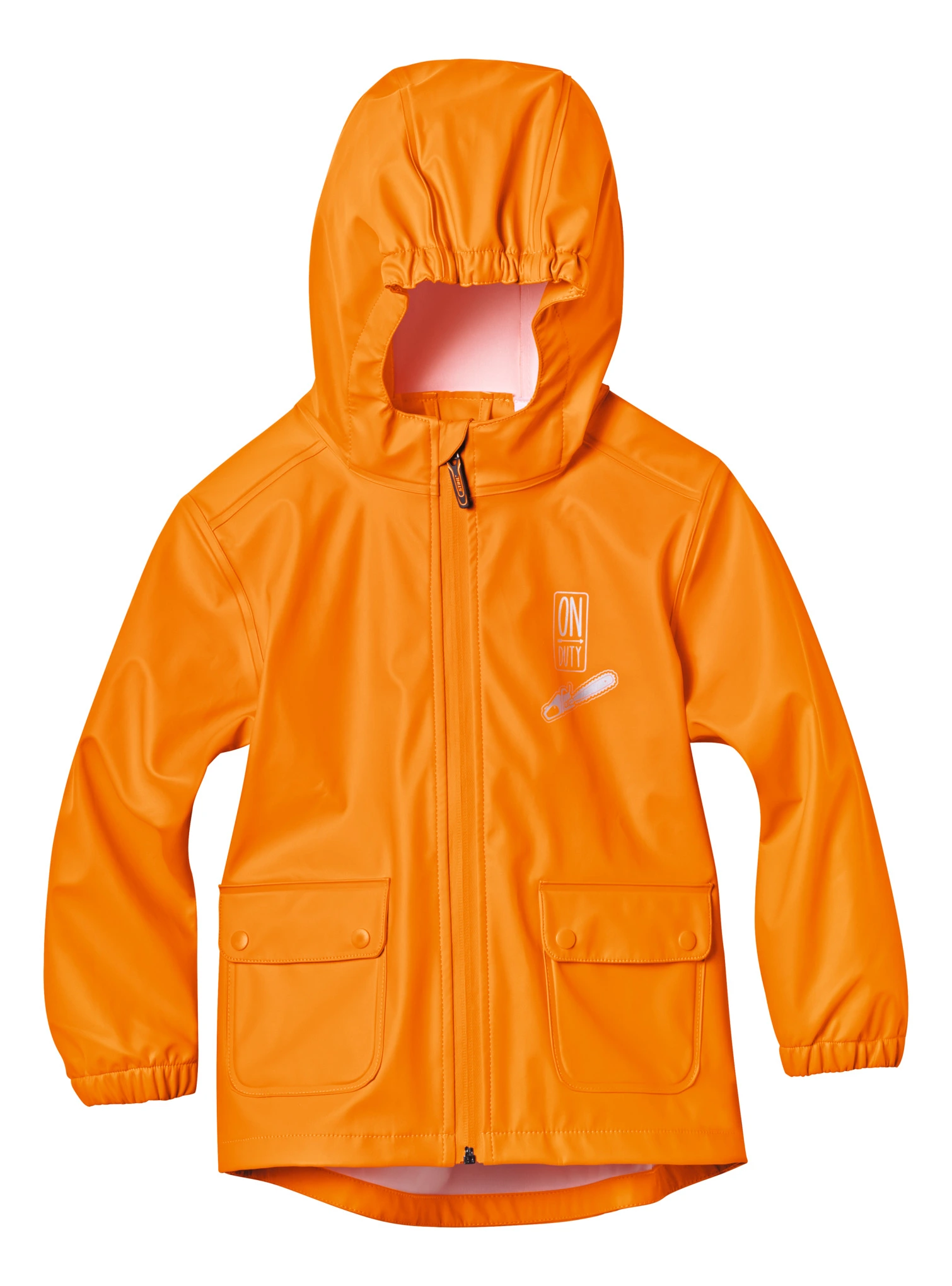 Πορτοκαλί αδιάβροχο μπουφάν, από 100% πολυεστέρα με επίστρωση πολυουρεθάνης, αδιάβροχο. Ανακλαστική μπροστινή εκτύπωση με αλυσοπρίονο, τύπωμα "ON DUTY" και λογότυπο STIHL. Με θερμοσυγκολλημένες ραφές.