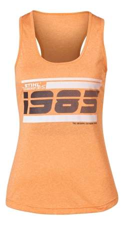 Πορτοκαλί Γυναικεία αθλητική μπλούζα, από 100% πολυεστέρα. Αναπνέων υλικό, χαλαρή εφαρμογή, με ελαφρώς στρογγυλεμένο στρίφωμα, "1985" τυπωμένο μπροστά, και λογότυπο "STIHL TIMBERSPORTS ®" στο πίσω μέρος.