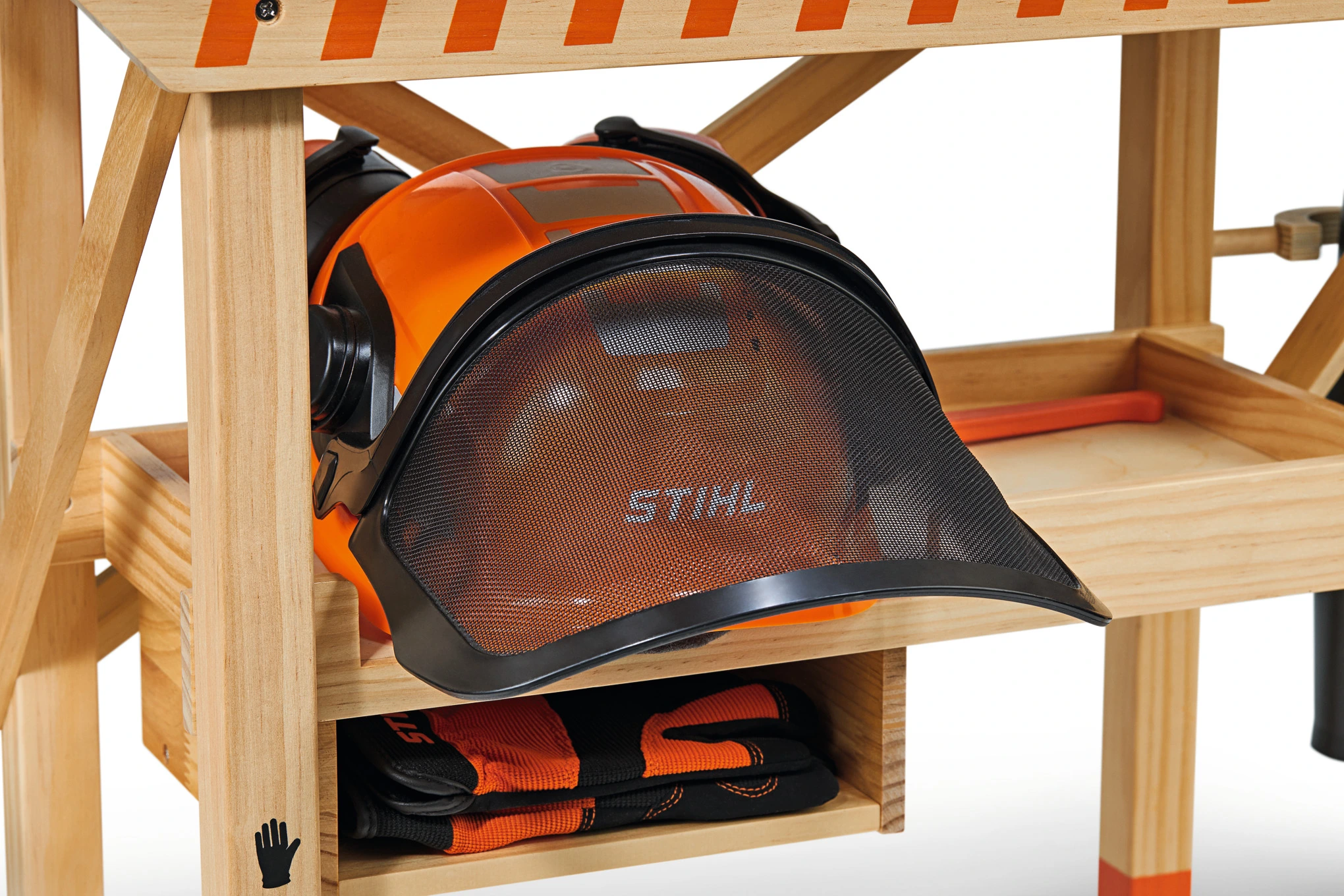 Ξεκινήστε τα από νωρίς! Πώς θα μπορούσατε να το κάνετε καλύτερα από αυτόν τον παιδικό πάγκο εργασίας της STIHL, που είναι με αγάπη κατασκευασμένος; Κατασκευασμένος από ξύλο, ο πάγκος εργασίας συνοδεύεται από μια σειρά ξύλινων εργαλείων και διαθέτει υποδοχές για ολόκληρη τη σειρά παιδικών εργαλείων STIHL: μπορεί να φιλοξενήσει αλυσοπρίονο, φυσητήρα, θαμνοκοπτικό, κράνος και γάντια. Ο πάγκος εργασίας με πιστοποίηση FSC προσφέρει επίσης επαρκή χώρο εργασίας για τις μεγαλύτερες εργασίες του μικρού σας. Παραδίδεται χωρίς εξοπλισμό, κράνος και γάντια. Διαστάσεις περίπου 59,5 x 29,5 x 94 cm.