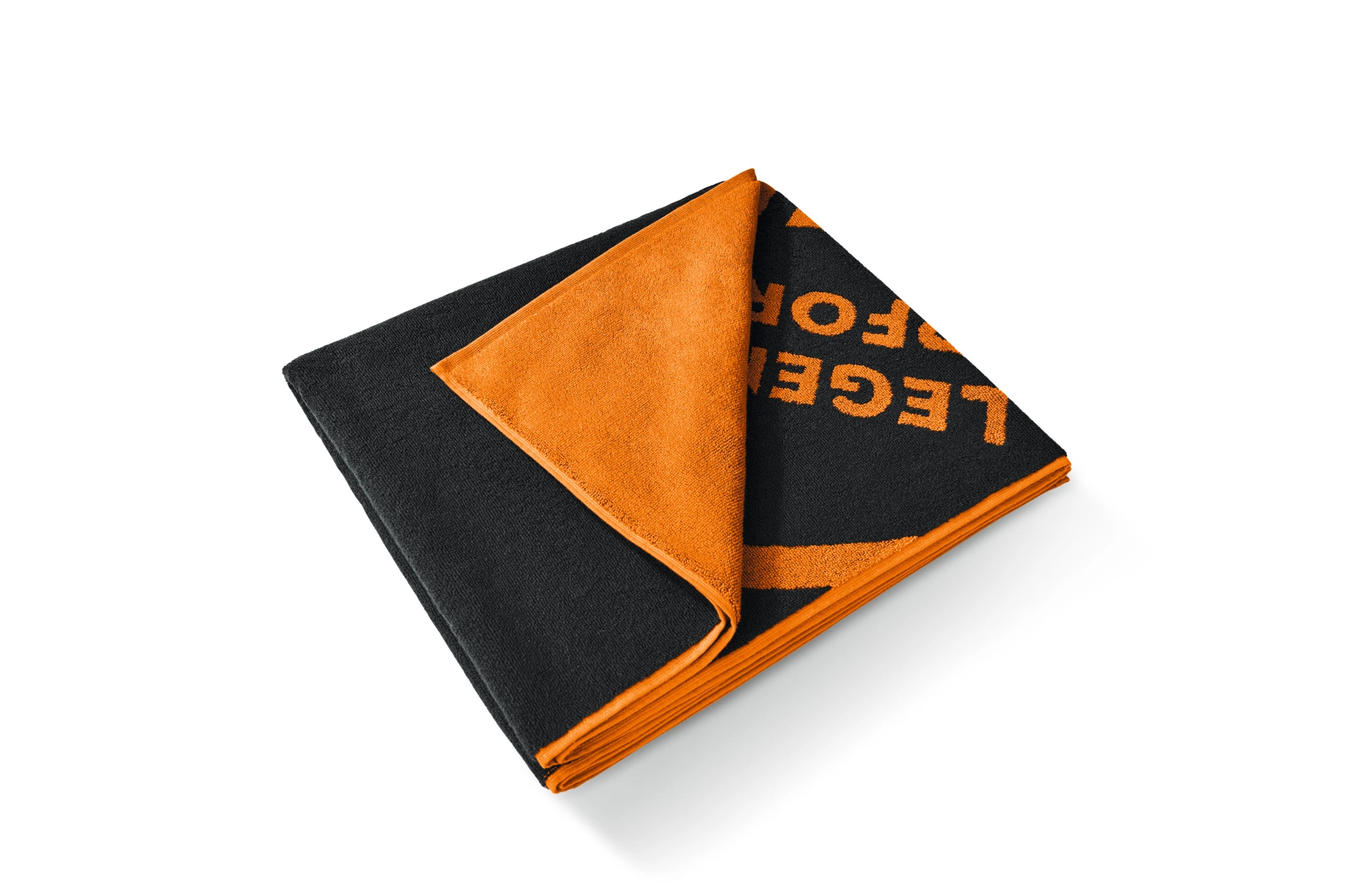 Ώρα για τα μπάνια μας! Μια τεράστια πετσέτα μπάνιου για την παραλία, τη σάουνα ή το μπάνιο στο σπίτι, φτιαγμένη από καθαρό βαμβάκι με μια όμορφη αίσθηση στο σώμα. Το μεγάλο λογότυπο STIHL που προσελκύει την προσοχή σε εντυπωσιακό μαύρο και πορτοκαλί χρώμα. Μέγεθος 80 x 180 cm. Υλικό: 100% βαμβάκι