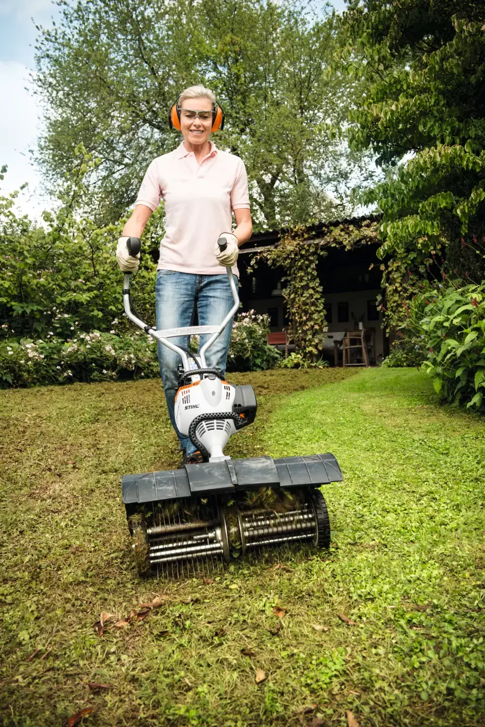 Καθαρίζει τον χλοοτάπητα από βρύα και μπλεγμένα στελέχη χόρτου, με προστατευτικό κάλυμμα και ποδιά, πλάτος εργασίας 50 cm, βάρος 8,3 kg.