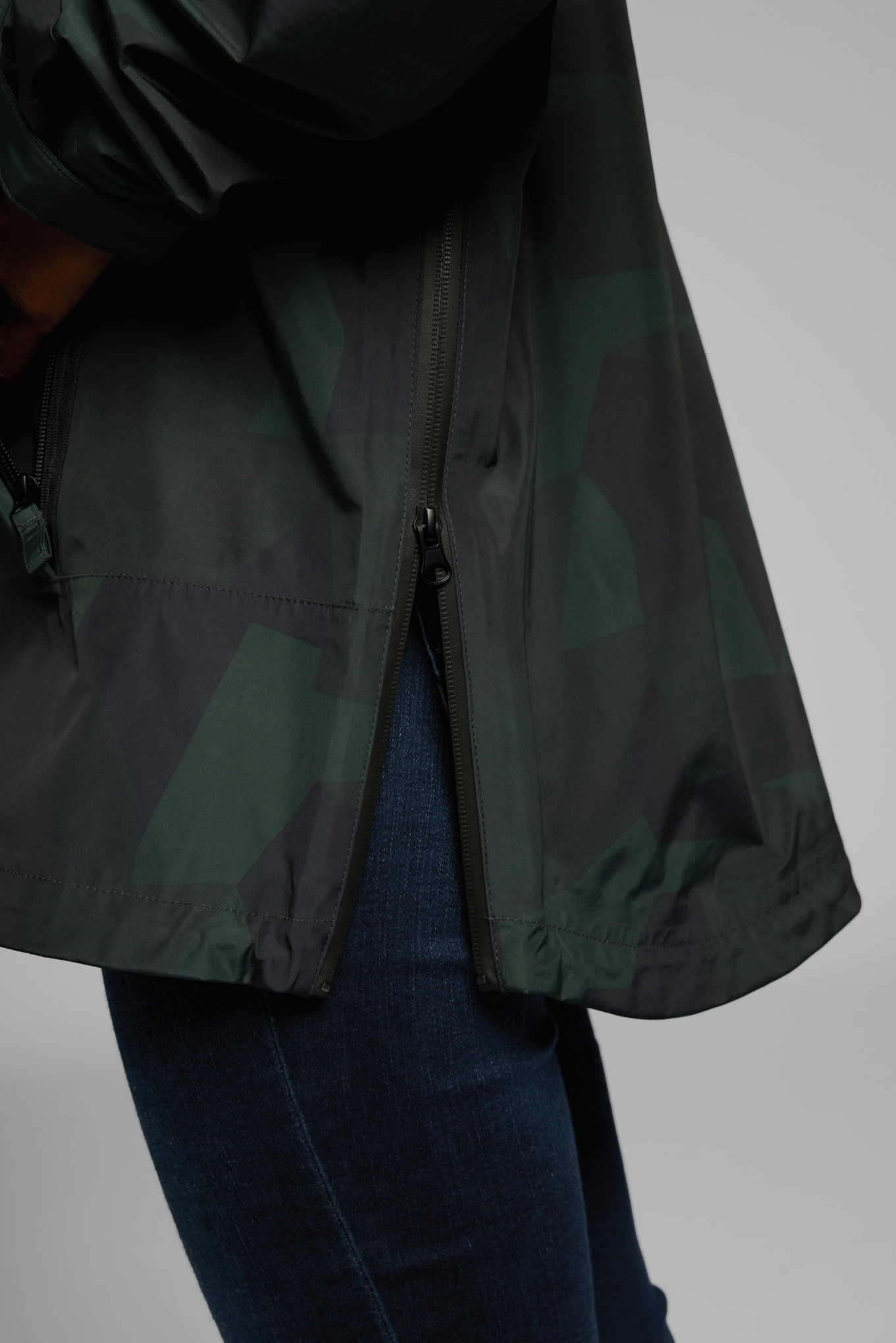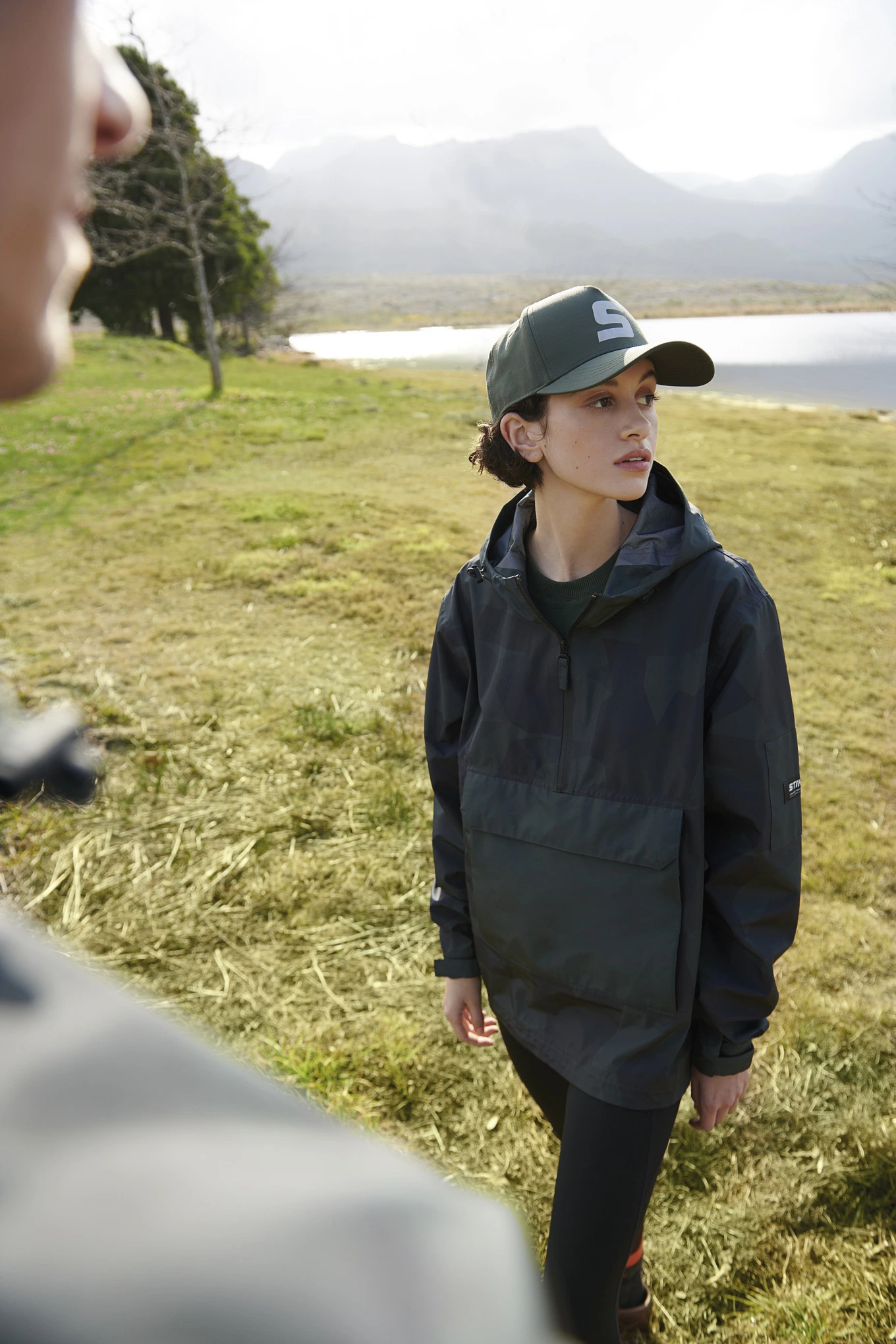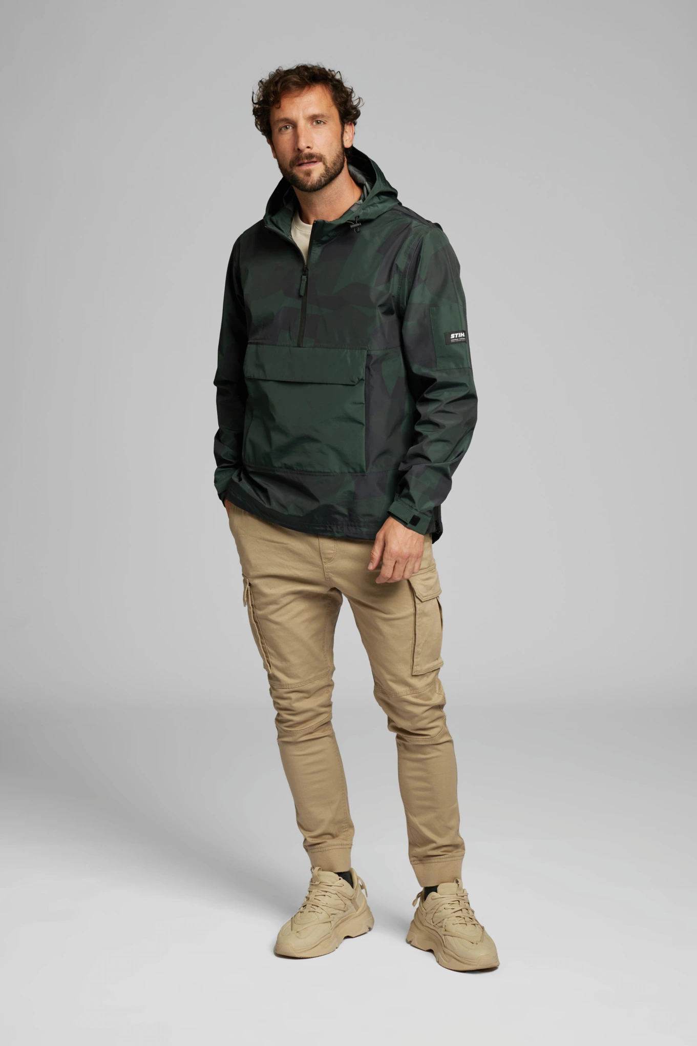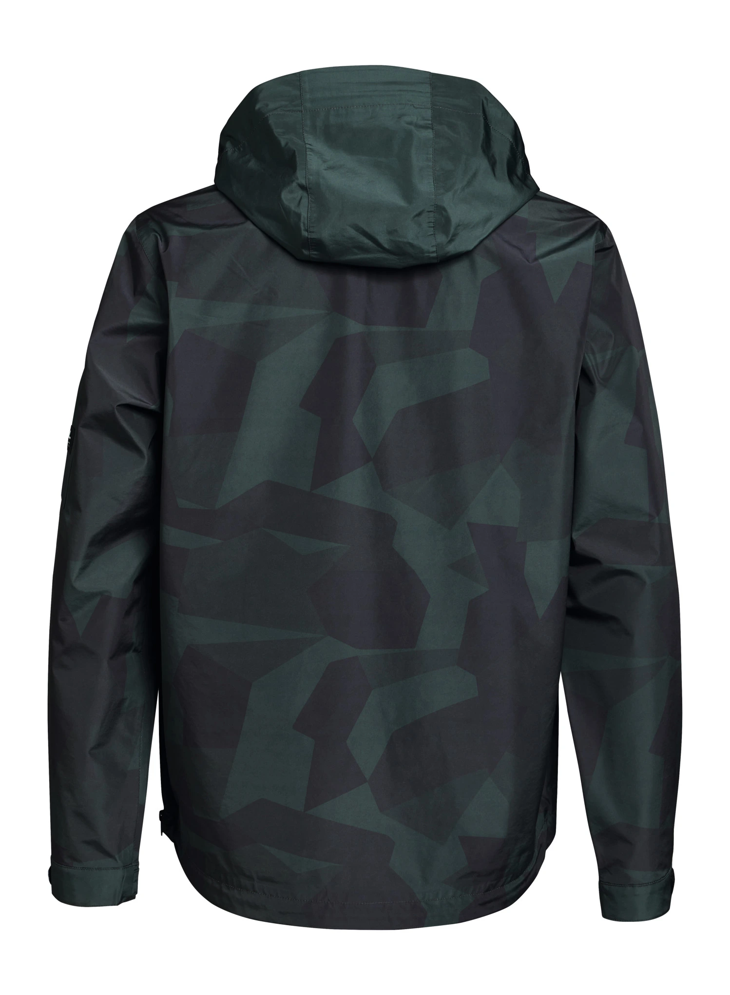 Πράσινο μπουφάν βροχής με εμφάνιση καμουφλάζ, με μεμβράνη TPU, στήλη ύδατος 5.000 mm και καλό αερισμό. Μπουφάν με σχεδιασμό πουλόβερ με φαρδύ λαιμό και πλαϊνό φερμουάρ, για να είναι εύκολο το τράβηγμα του ρούχου. Οι ραφές είναι επικαλυμμένες και τα μανίκια μπορούν να σφίγγουν επιπλέον με Velcro για να κρατούν τη βροχή μακριά. Η πρακτική μεγάλη μπροστινή τσέπη μπορεί να χρησιμοποιηθεί για την ασφαλή μεταφορά κλειδιών, κινητού τηλεφώνου, πορτοφολιού κ.λπ. στη βροχή. Στο αριστερό μανίκι υπάρχει μια μικρή υφαντή ετικέτα "LEGENDARY PERFORMANCE".