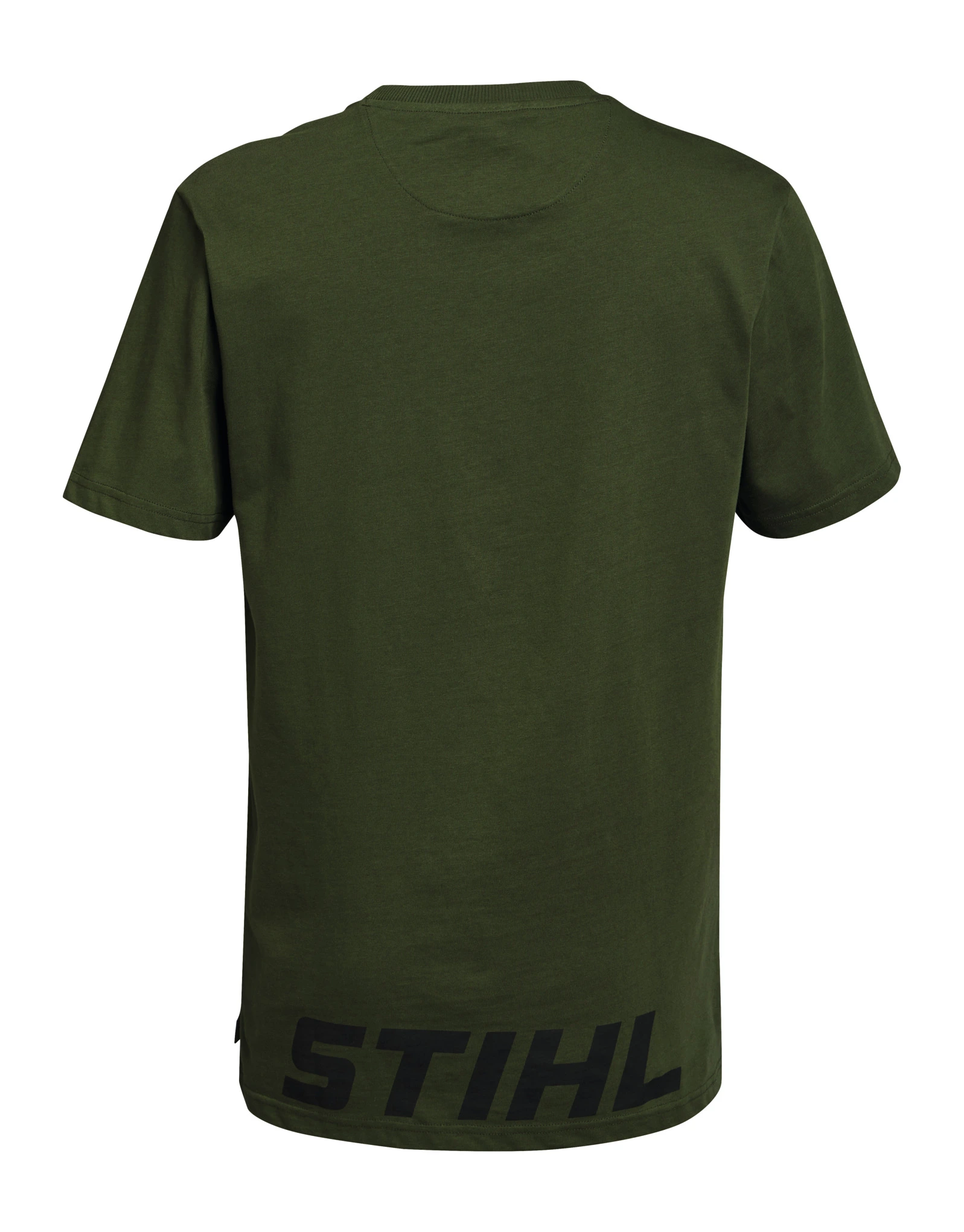 Με την πρώτη ματιά, αυτό το σκούρο πράσινο ανδρικό μπλουζάκι δεν μοιάζει καθόλου με μπλουζάκι STIHL λόγω της μονόχρωμης μπροστινής πλευράς. Στο πίσω μέρος, ωστόσο, ο ενθουσιασμός για τη μάρκα γράφεται σε μεγάλα γράμματα χάρη στη μεγάλη μαύρη εκτύπωση του λογότυπου STIHL. Αυτό το μπλουζάκι με στρογγυλό λαιμό έχει ελαφρώς oversized εφαρμογή και το πίσω μέρος είναι μακρύτερο από το μπροστινό.