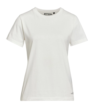 Μπορεί να συνδυαστεί σχεδόν με τα πάντα: ένα γυναικείο μπλουζάκι από οργανικό βαμβάκι σε φυσικό λευκό χρώμα με απλό στρογγυλό λαιμό και μικρό τυπωμένο εικονίδιο πριονιού STIHL στο μπροστινό αριστερό στρίφωμα. Όλες οι εκτυπώσεις δημιουργούνται με βιολογικές βαφές.