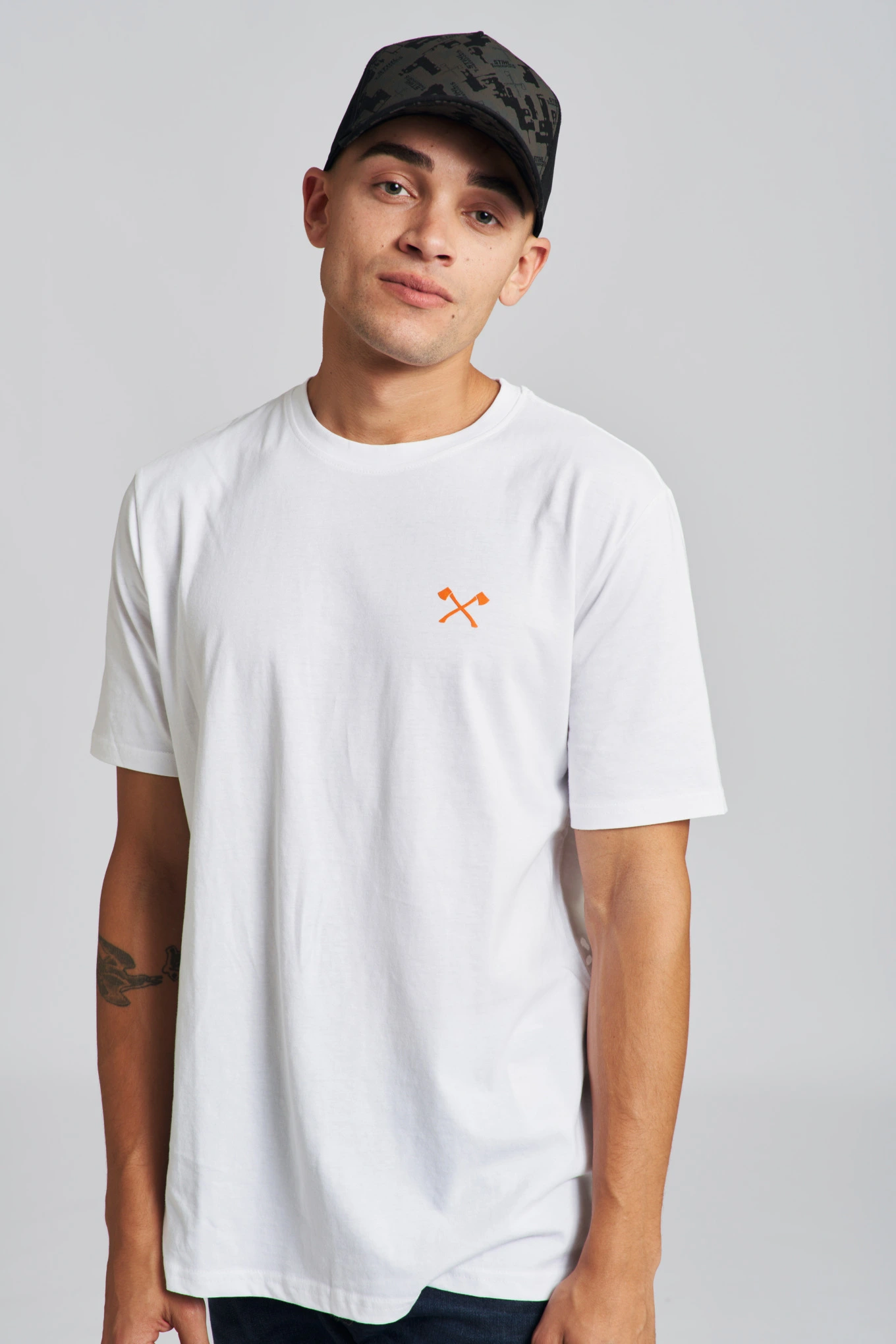 Το μπροστινό μισό διαθέτει ένα all-over τύπωμα με μικρά λογότυπα TIMBERSPORTS®, σταυρωτά τσεκούρια και στυλιζαρισμένα θραύσματα ξύλου. Ρυθμιζόμενο.