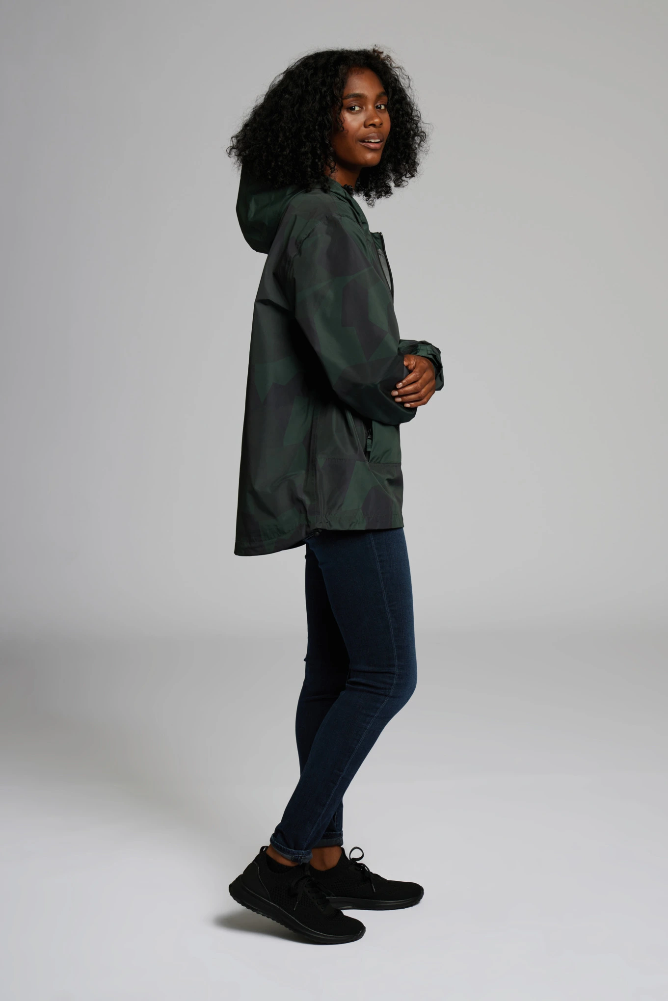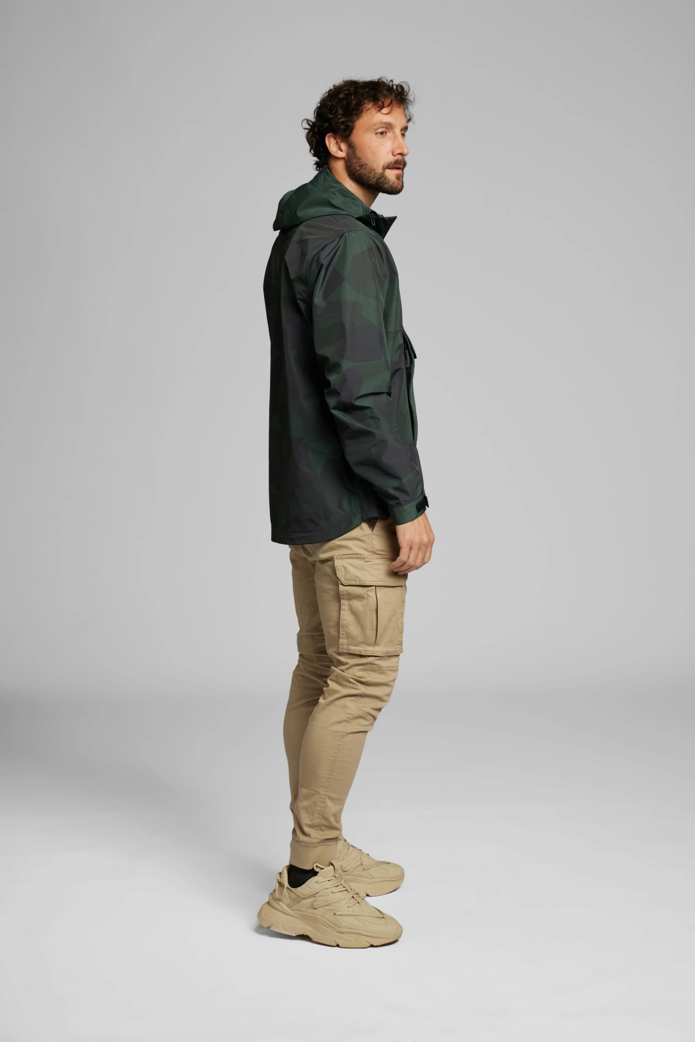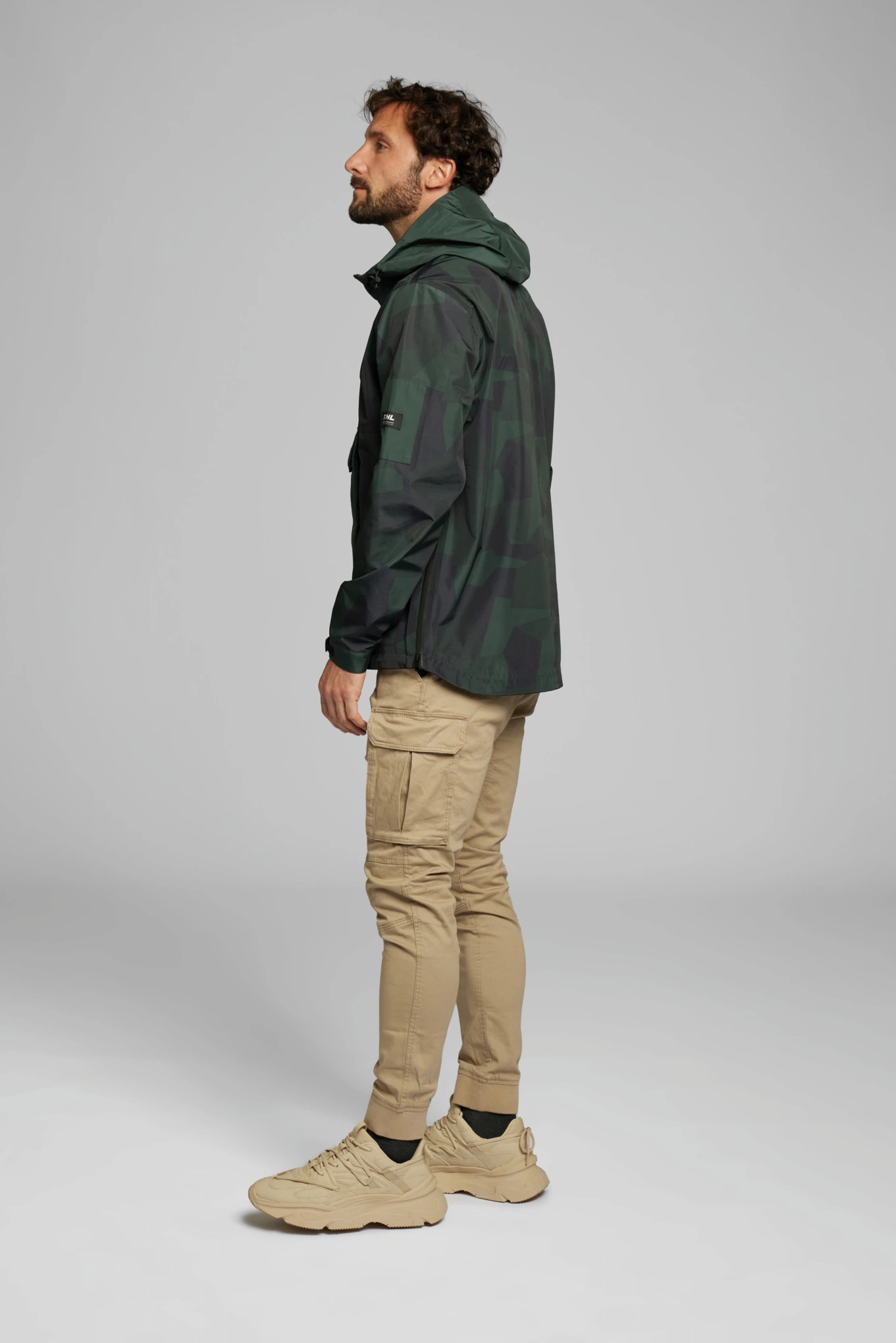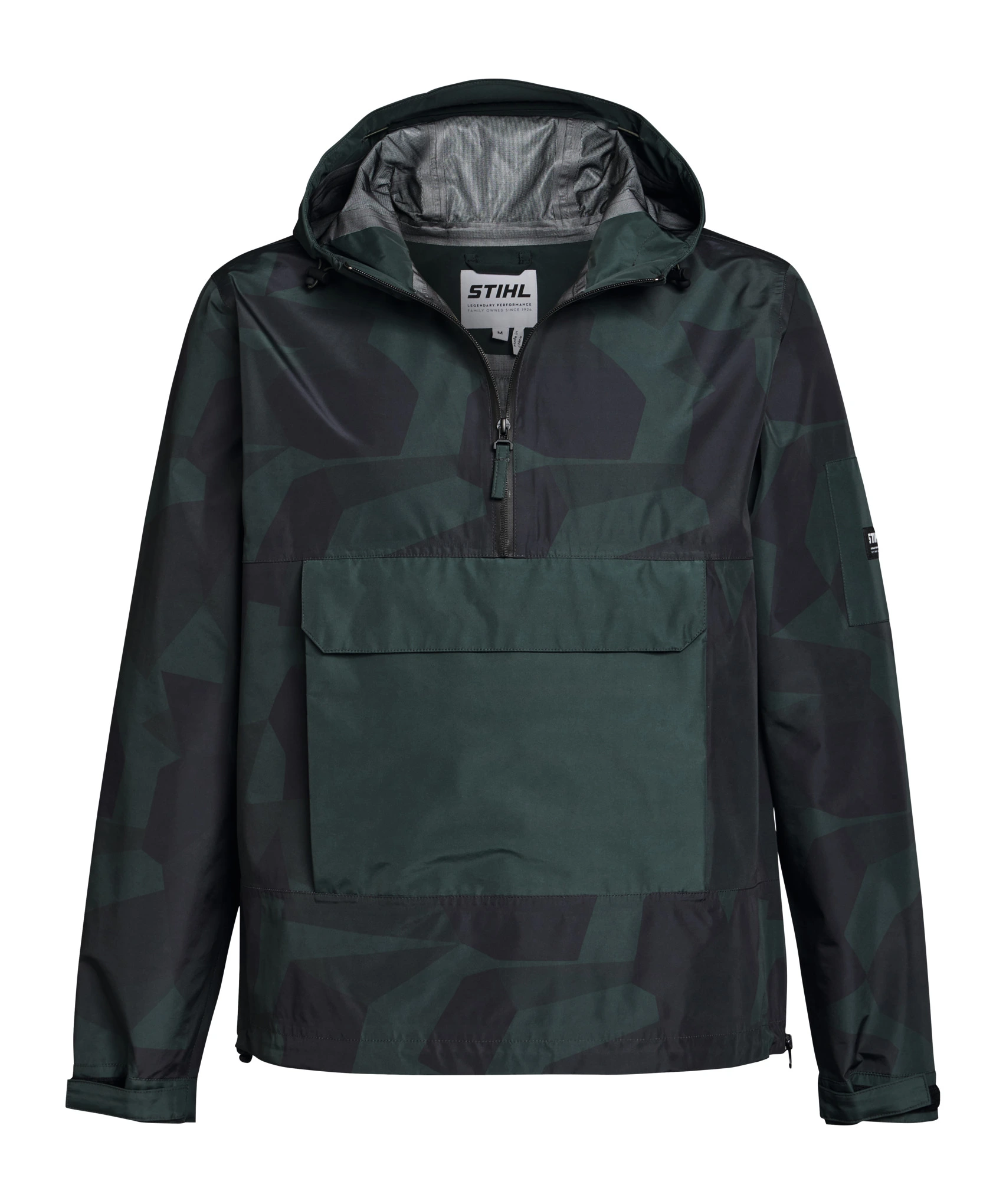 Πράσινο μπουφάν βροχής με εμφάνιση καμουφλάζ, με μεμβράνη TPU, στήλη ύδατος 5.000 mm και καλό αερισμό. Μπουφάν με σχεδιασμό πουλόβερ με φαρδύ λαιμό και πλαϊνό φερμουάρ, για να είναι εύκολο το τράβηγμα του ρούχου. Οι ραφές είναι επικαλυμμένες και τα μανίκια μπορούν να σφίγγουν επιπλέον με Velcro για να κρατούν τη βροχή μακριά. Η πρακτική μεγάλη μπροστινή τσέπη μπορεί να χρησιμοποιηθεί για την ασφαλή μεταφορά κλειδιών, κινητού τηλεφώνου, πορτοφολιού κ.λπ. στη βροχή. Στο αριστερό μανίκι υπάρχει μια μικρή υφαντή ετικέτα "LEGENDARY PERFORMANCE".