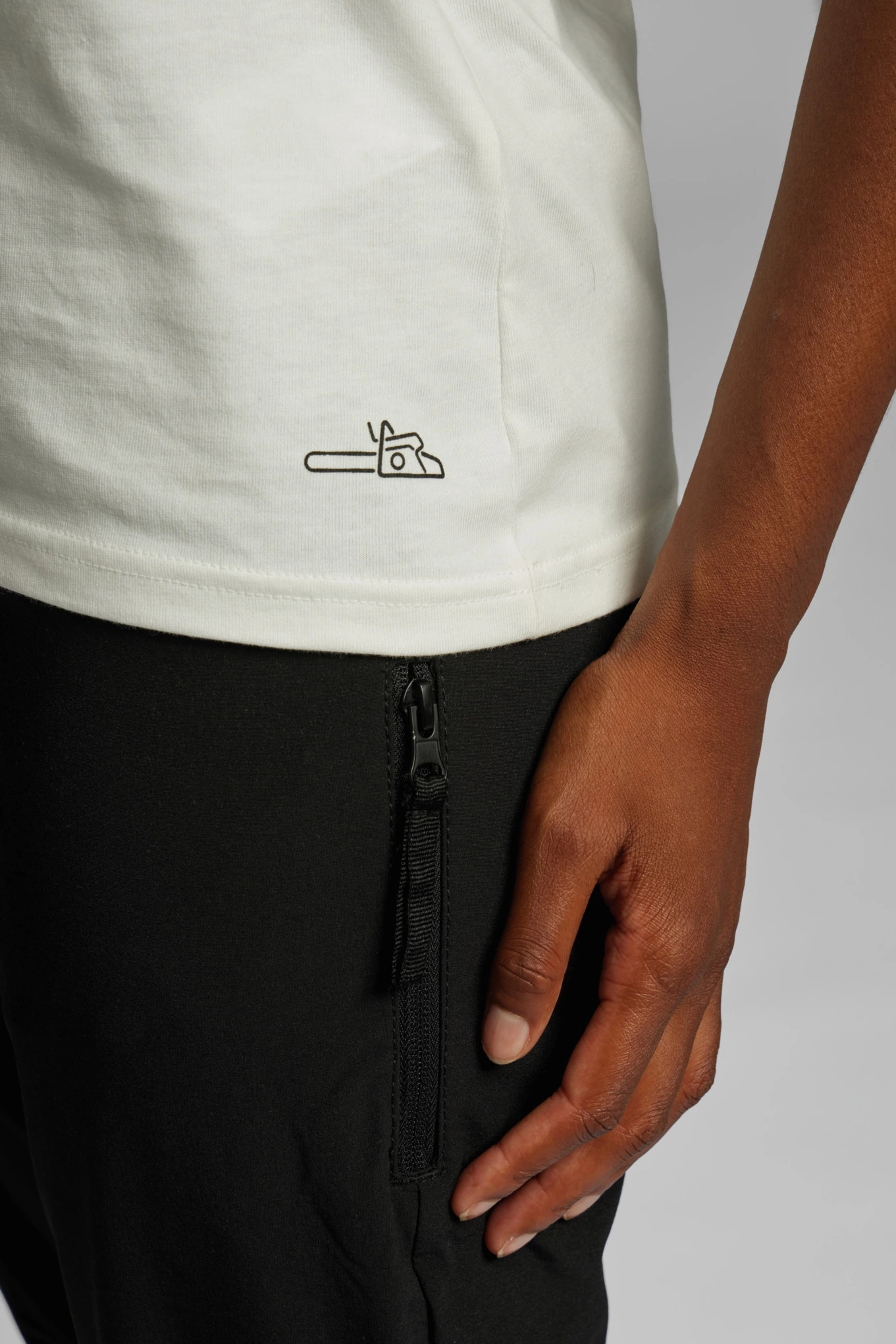 Μπορεί να συνδυαστεί σχεδόν με τα πάντα: ένα γυναικείο μπλουζάκι από οργανικό βαμβάκι σε φυσικό λευκό χρώμα με απλό στρογγυλό λαιμό και μικρό τυπωμένο εικονίδιο πριονιού STIHL στο μπροστινό αριστερό στρίφωμα. Όλες οι εκτυπώσεις δημιουργούνται με βιολογικές βαφές.