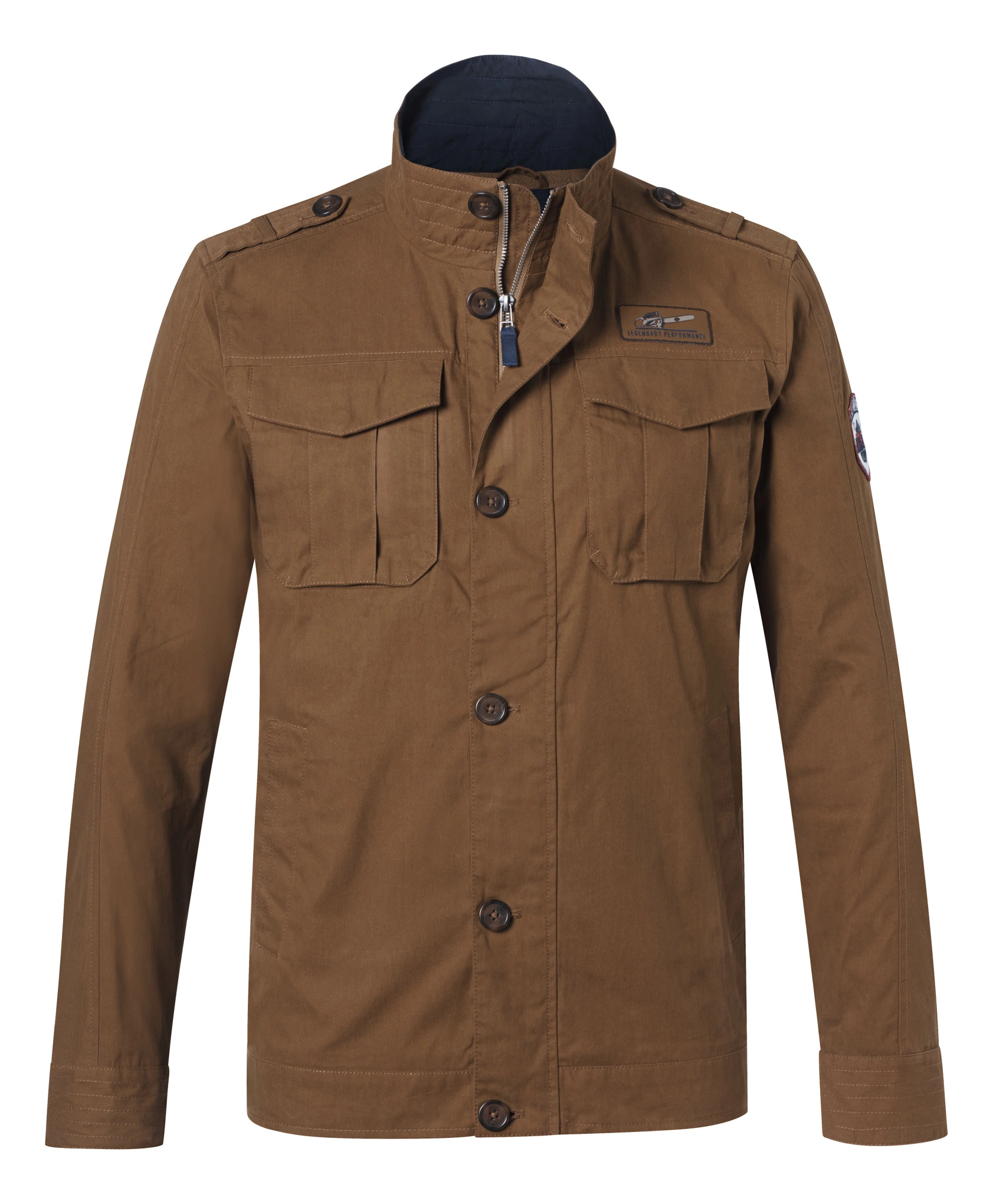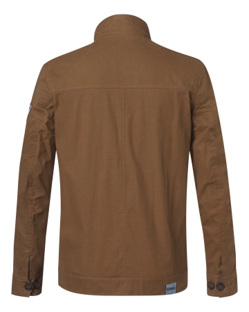 Ανοιχτό καφέ μπουφάν, από 75% βαμβάκι και 25% νάιλον. Η εσωτερική επένδυση, είναι από 100% βαμβάκι, ελαφρώς βουρτσισμένη επιφάνεια με επίστρωση κεριού, μεταλλικό φερμουάρ με κορδόνι και κουμπιά, δύο θήκες με κουμπιά, με δύο εσωτερικές τσέπες, η μία με φερμουάρ..