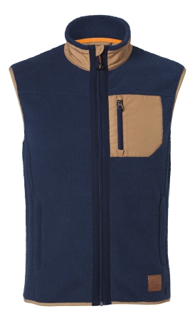 Γιλέκο Fleece μπλε με λεπτομέρειες στο χρώμα της άμμου, από 85% πολυεστέρα, 15% βισκόζη, όρθιο κολάρο, τσέπη στο χρώμα της άμμου με φερμουάρ στο στήθος, με πλαϊνές τσέπες.