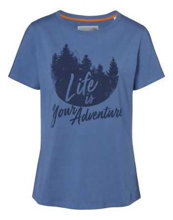 Χρώμα μπλε, 95 % βαμβάκι, 5 % ελαστάνη, στάμπα με σχέδιο ελάτων και επιγραφή «LIFE IS YOUR ADVENTURE» στην μπροστινή πλευρά, εσωτερικό ρέλι λαιμόκοψης σε πορτοκαλί χρώμα.