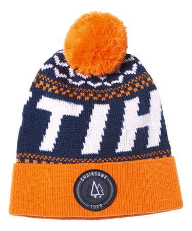 Μπλε και πορτοκαλί σκούφος, από 70% πολυακρυλικό και 30% μαλλί, με πλεκτό το σήμα STIHL και πορτοκαλί φουντάκι. Με το σήμα "CHAINSAWS". Ενα μέγεθος ταιριάζει σε όλους