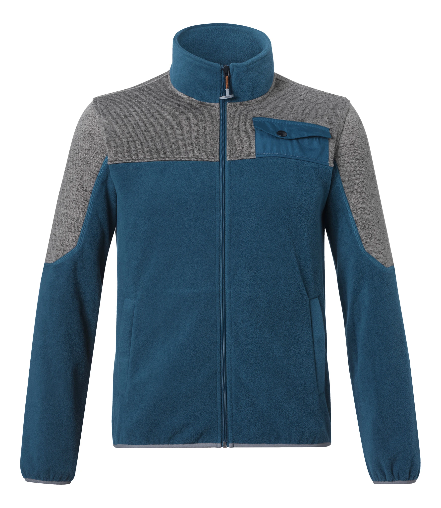 Ζακέτα Fleece μπλε γκρι, από 100% πολυεστέρα, με όψη φανέλας στους ώμους και στα άνω μανίκια, όρθιο κολάρο, μία τσέπη στο στήθος, και δύο τσέπες με φερμουάρ στην μέση.