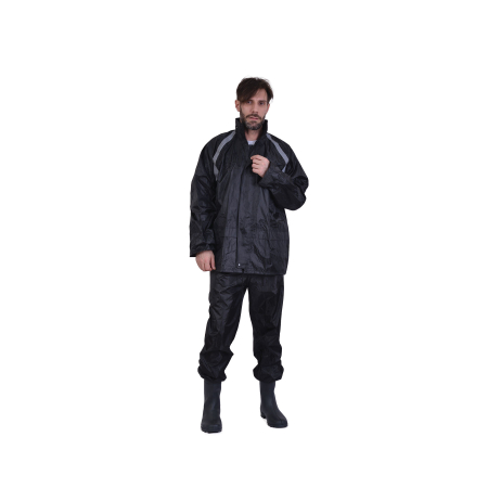 Στολή αδιάβροχη EASY RIDER (σακάκι-παντελόνιι) από POLYAMIDE σε χρώμα μαύρο με ανακλαστικές λεπτομέρειες στην πλάτη και στο στήθος.