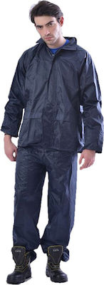 Στολή αδιάβροχη (σακάκι-παντελόνι) από POLYAMIDE σε χρώμα μπλε με φερμουάρ και από πάνω πατιλέτα με Velcro, κουκούλα και εσωτερική μανσέτα.