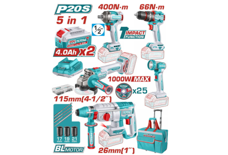 TOTAL Σετ Εργαλείων Μπαταρίας 20V (2x4.0Ah) - 5 Τεμάχια
