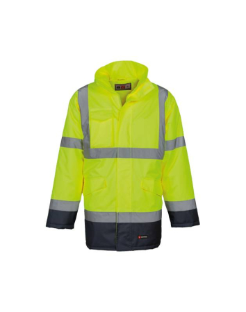 Δίχρωμο παρκά υψηλής ορατότητας με ανακλαστικές ταινίες, πλήρες φερμουάρ με καπάκι, κουκούλα που μπορεί να διπλωθεί μέσα στον γιακά, ελαστικές μανσέτες με ραβδώσεις, δυο μπροστινές τσέπες με καπάκι, τσέπη για κινητό και δακτύλιο στήριξης για κάρτες. Εσωτερικό στρώμα με επένδυση, εσωτερική τσέπη με velcro, θερμοκολλητικές ραφές. Σύνθεση από 100% πολυεστέρα επικαλυμμένη με πολυουρεθάνη.